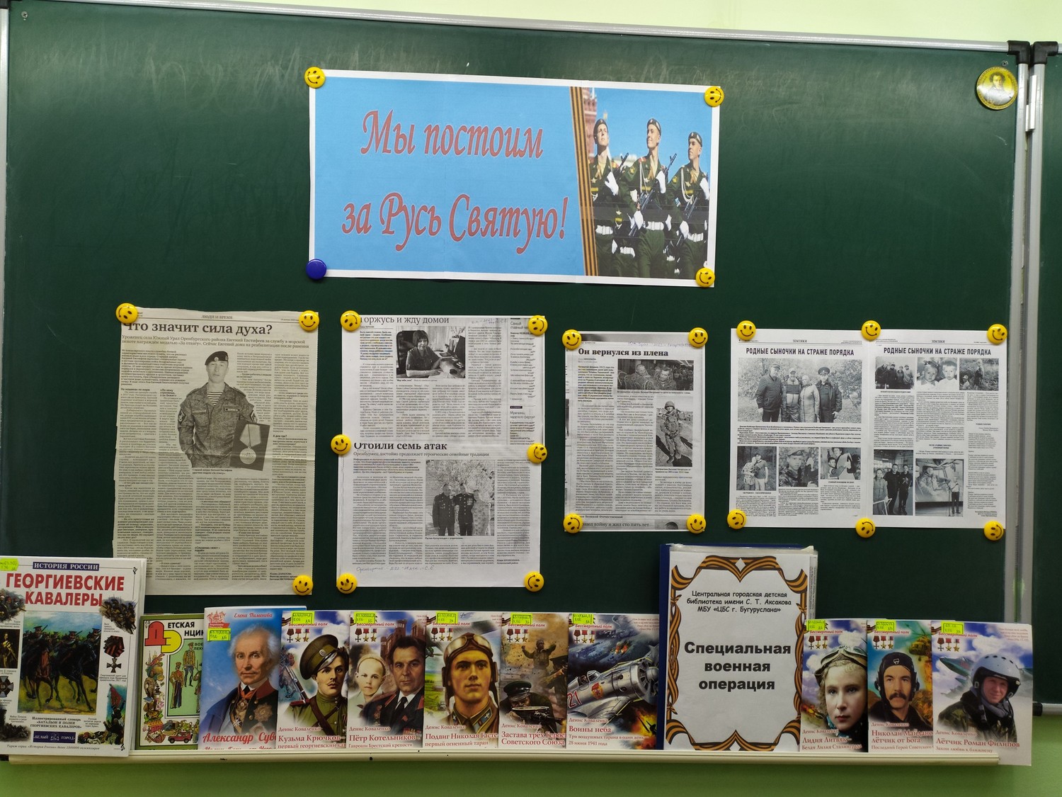 Вниманию учащихся была представлена выставка «Мы постоим за Русь Святую» и газетные статьи об оренбургских военнослужащих, которые мужественно и достойно выполняют свой воинский долг в ходе СВО.