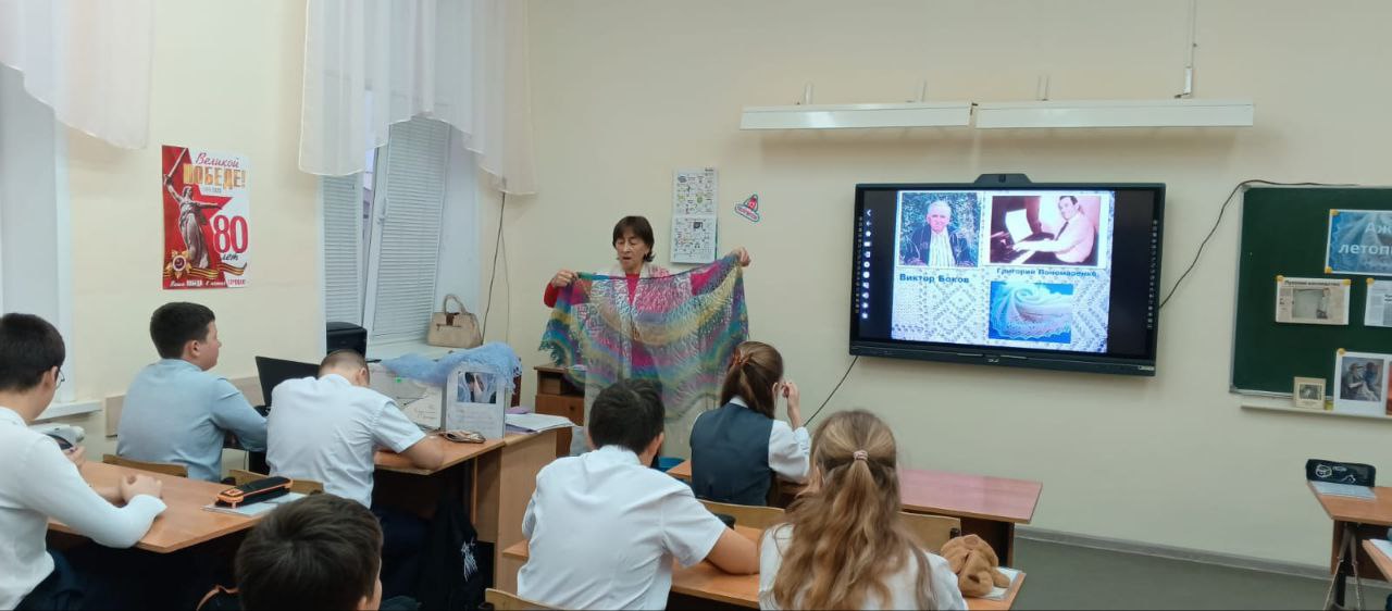 13 октября в рамках областной акции «Дни Оренбургского пухового платка» ЦГДБ имени С.Т. Аксакова для учеников 7 «А» класса Гимназии № 1 провела краеведческий час «Кружевное чудо Оренбургского края».